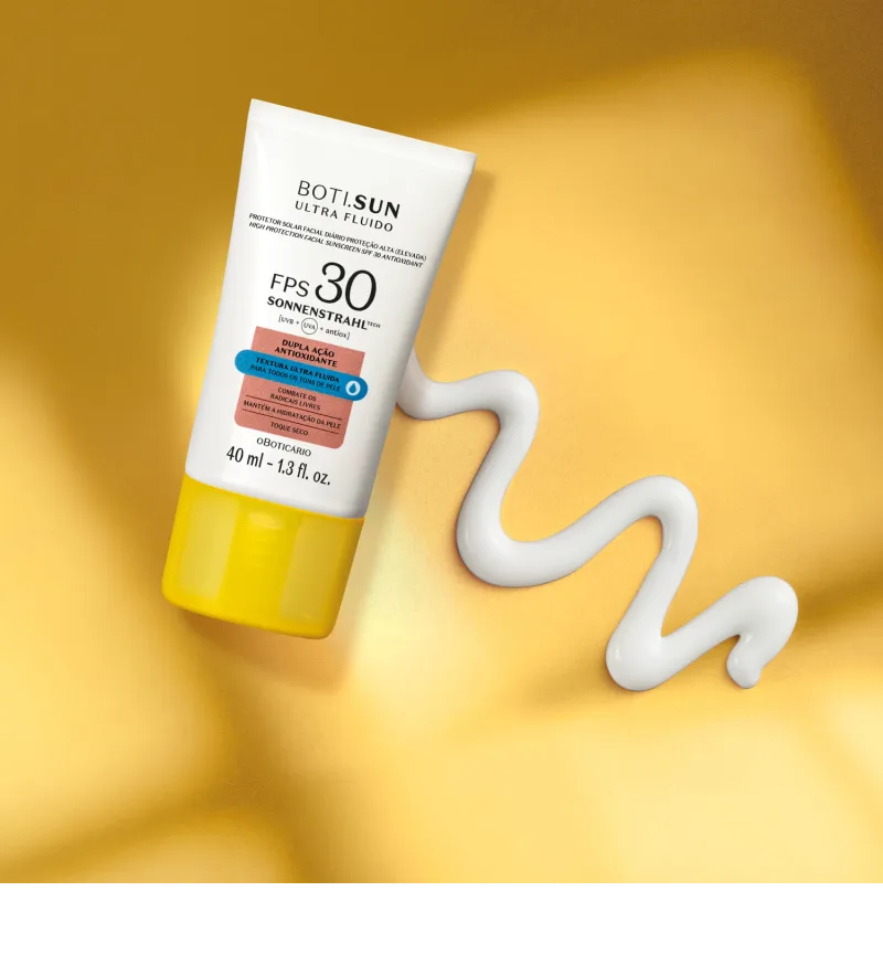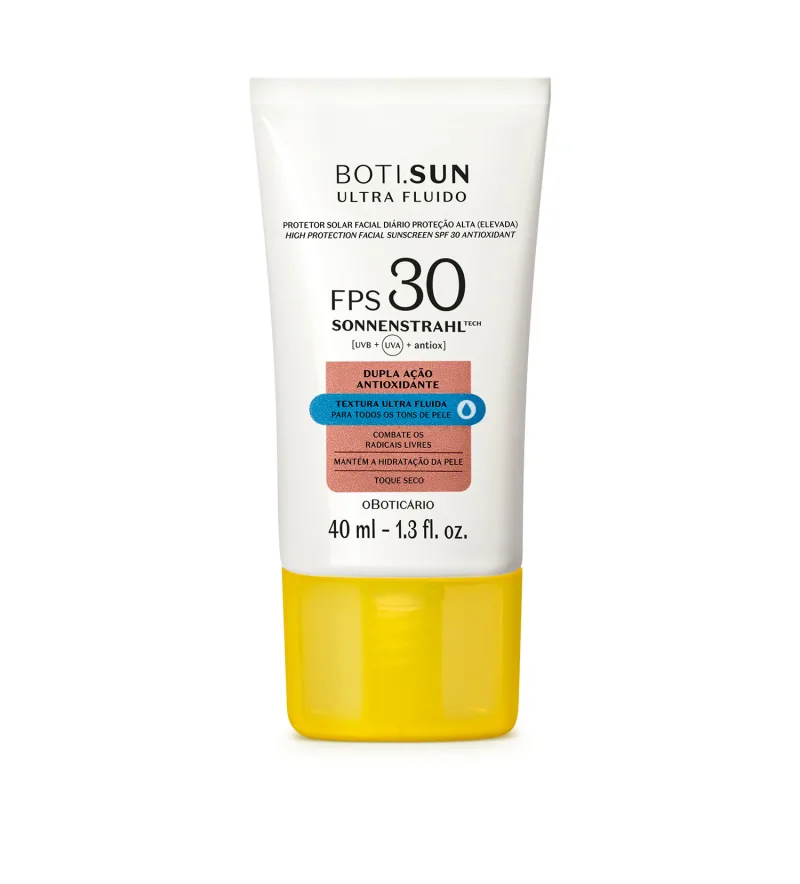 O Protetor Solar Facial Antioxidante FPS 30 Boti.Sun Ultra Fluido será seu aliado na sua rotina diária, promovendo dupla ação antioxidante, de combate e prevenção dos danos dos radicais livres, sendo um poderoso agente contra o envelhecimento precoce, manchas solares e outros efeitos da exposição ao sol.