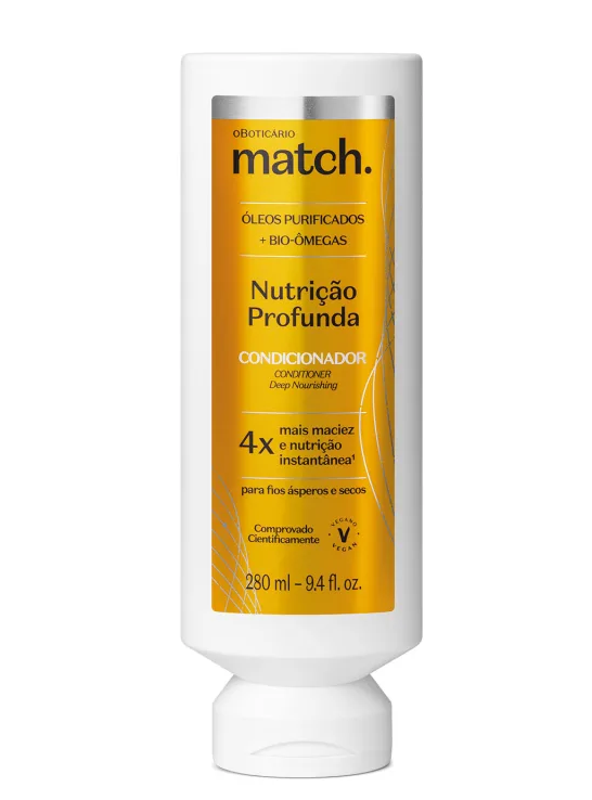 Nutrição Profunda é uma evolução de match. O Boticário. Com alta perfumação, revoluciona ainda mais, para trazer toda credibilidade da ciência a favor da beleza e do tratamento capilar.