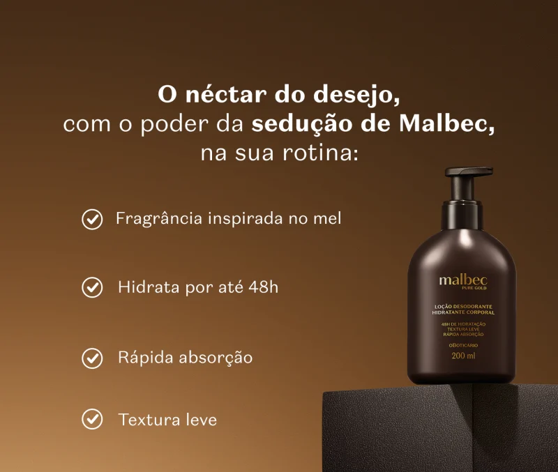 A Loção Hidratante Desodorante Corporal Malbec Pure Gold vai acrescentar uma dose extra de sedução na sua rotina de cuidados com a pele.