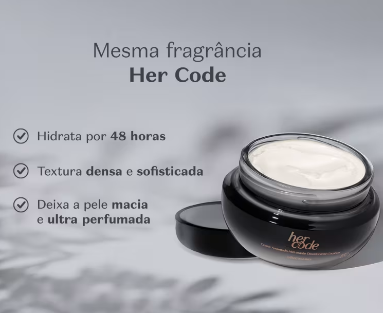 Ideal para mulheres que querem descobrir e a explorar a sensualidade à flor da pele, o Creme Aveludado Hidratante Desodorante Corporal Her Code contém fórmula de rápida absorção formando um filme protetor que nutre intensamente a pele, deixando-a macia, aveludada, desodorizada e perfumada. Uma ótima opção de presente para mulher!