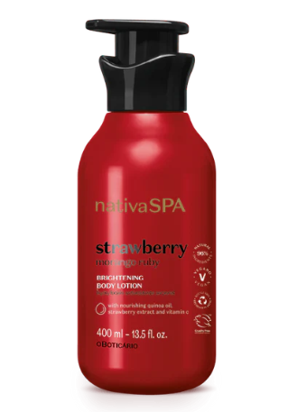 Nada como unir hidratação intensa com um aroma irresistível e a Loção Corporal Hidratante Nativa SPA Morango Ruby é exatamente assim! Formulada com Vitamina C, recupera a luminosidade da pele e reduz os danos causados pelos radicais livres, além de contar com a fragrância incrível de Morango.