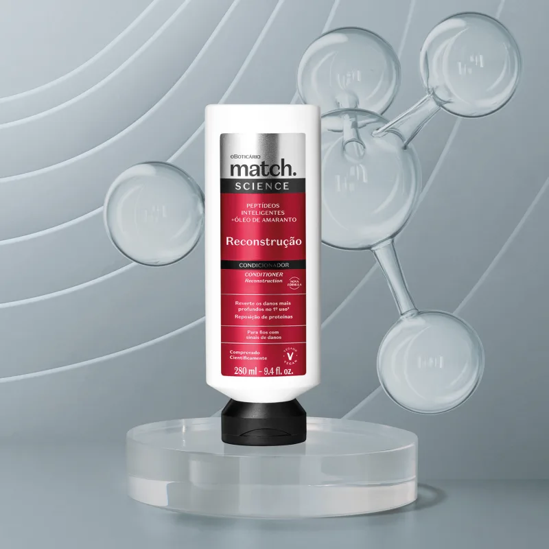 Match Science Reconstrução é a primeira linha da plataforma Match Science. A linha é indicada para quem tem fios danificados pelo uso constante de instrumentos de calor (secador, chapinha, babyliss) e/ou produtos químicos, proporcionando soluções para cada tipo de dano dos fios. Resultados na primeira aplicação, comprovado cientificamente.