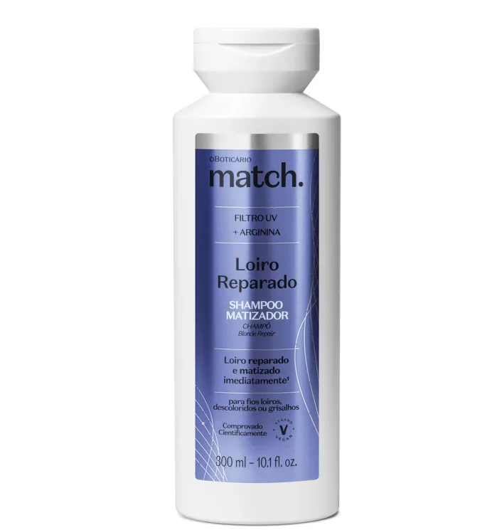 O Shampoo Matizador Match Loiro Reparado remove impurezas sem ressecar. Com pigmentos violeta, neutraliza imediatamente o amarelado dos fios.